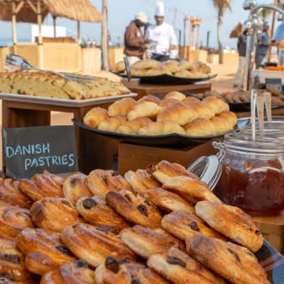 Meals are served in the beachside dining area, featuring live cooking stations that offer a variety of healthy and delicious options tailored to young palates.